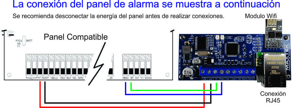 - Conexión a panel de alarma TIP y RING.